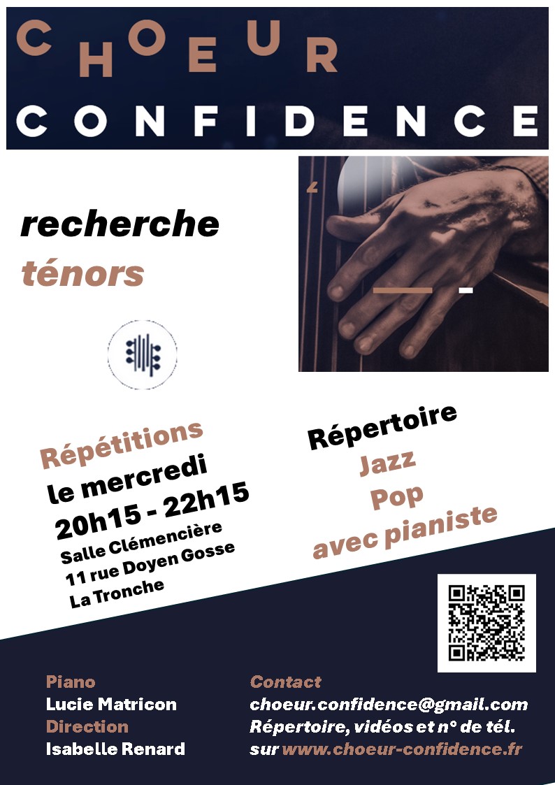 Le chœur Confidence, ensemble d'une vingtaine de chanteurs, recherche des ténors pour explorer avec eux les harmonies du jazz vocal et de la pop, avec l'accompagnement d'une pianiste.