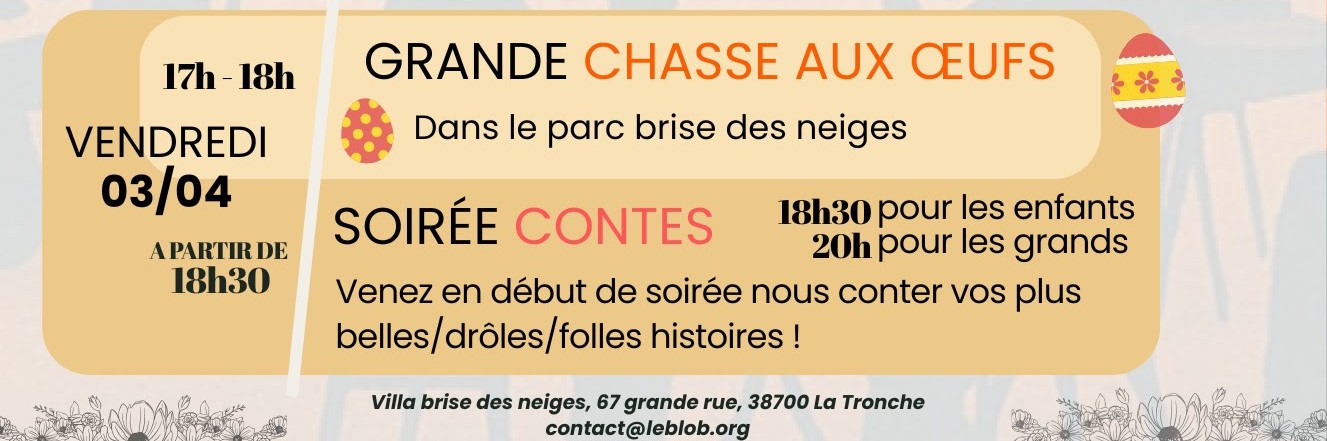 Le Blob organise une grande chasse aux œufs (17h), suivi d'une soirée contes pour petits (18h30) et grands (20h) le vendredi 3 avril dans le parc Brise des neiges.